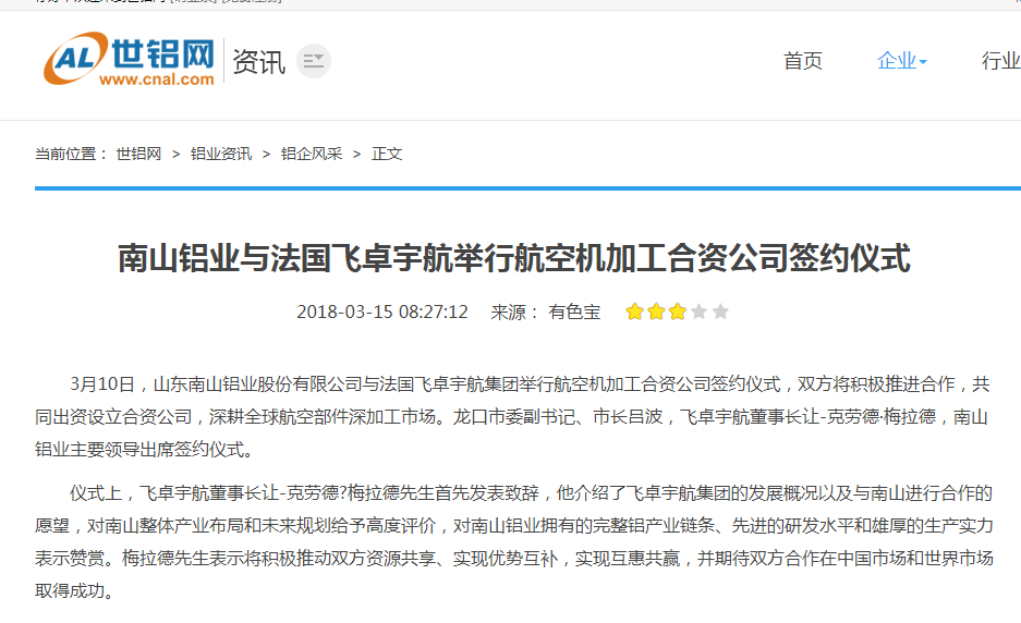南山鋁業(yè)與法國飛卓宇航舉行航空機加工合資公司簽約儀式-世鋁網